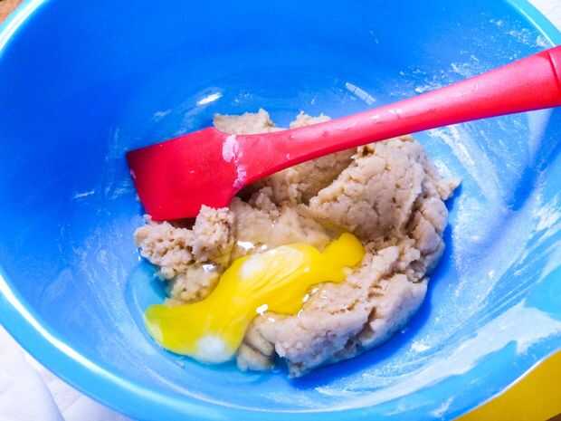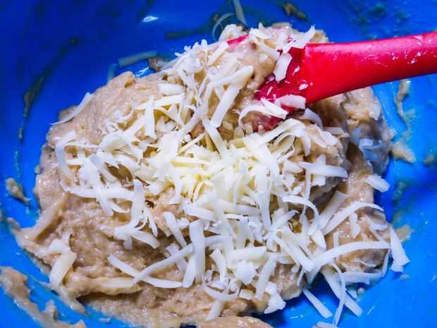 Poner la masa en un tazón y deje que se enfríe durante un minuto. Limpie la cacerola mientras se enfría, agregar los huevos entonces a la taza, uno por uno, cada uno completamente en la masa de mezcla con la espátula antes de agregar otro. Incorpore el queso rallado.