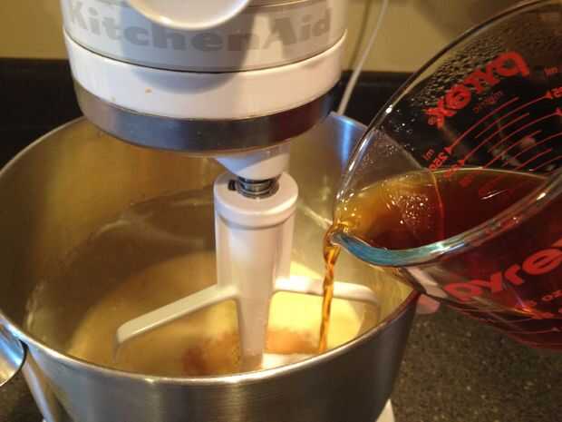 Comenzar mezclando el yogur, el azúcar y el plátano hasta que esté cremosa. A continuación agregue los huevos y la vainilla hasta que se mezcle bien. Finalmente agregue el té frío y mezclar hasta incorporar bien. La mezcla debe ser super aguada en este punto.