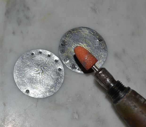 Marca cinco poco agujero en la parte inferior de cada caps y en la parte superior (como foto). Perfore los orificios con un clavo pequeño y luego con uno más grande, con la ayuda de un martillo. Luego con la dremel o el papel de lija suave detrás de los agujeros.