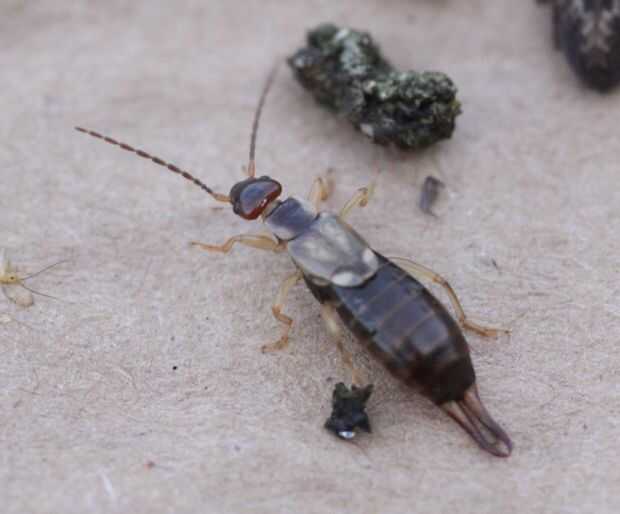La tijereta común, Forficula auricularia, es nocturna y se alimenta de una gran variedad de plantas y otros insectos. Solía creer que tijeretas arrastrarse dentro del oído humano, endecha huevos, que se salen del huevo y comer sus cerebros. Tijeretas como viven en lugares calientes, húmedos y oscuros como bajo trozos de cartón y en viejas cajas de madera en el jardín. |