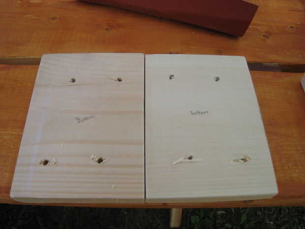 Una vez que los centros se cortan, el fondo tendrá unos agujeros de drenaje. He utilizado cuatro agujeros de 1/4" de drenaje en un patrón cuadrado, usted puede ser capaz de usar tres.