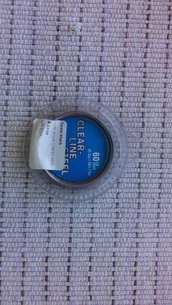 Nylon recubierto de alambre y dos mangas que prensan de alambre. Usted puede encontrar en cualquier tienda de pesca y aparejos.