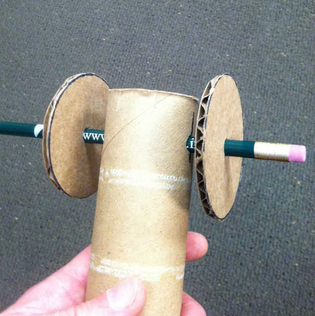 Las ruedas delanteras y eje! Preparé las ruedas delanteras antes de tiempo, son círculos de diámetro 2 1/2 pulgada cortados de cartón corrugado con un agujero de arranque asomó en el centro con un lápiz puntiagudo. Empujar el lápiz a través de las ruedas para que ajuste apretado en el lápiz, el lápiz debe girar libremente en los agujeros en el tubo de toalla de papel.