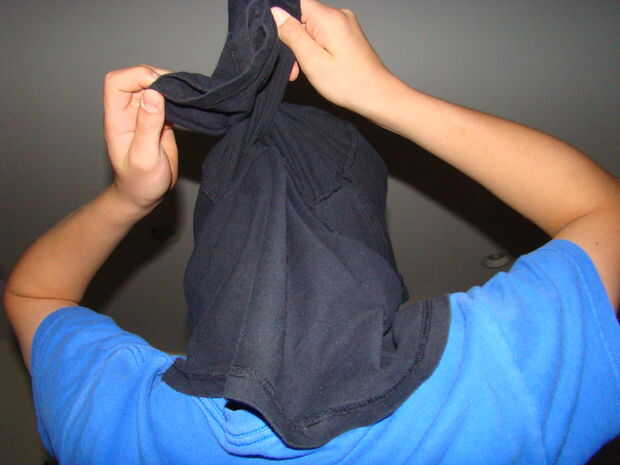 ahora espero tu boyscout o algo porque este nudo es tan difícil. Toma las dos mangas y atarlos detrás de la cabeza como si estaban empezando a atar sus zapatos (o sólo la mitad de un nudo cuadrado lazo (derecha sobre izquierda y a través del orificio))