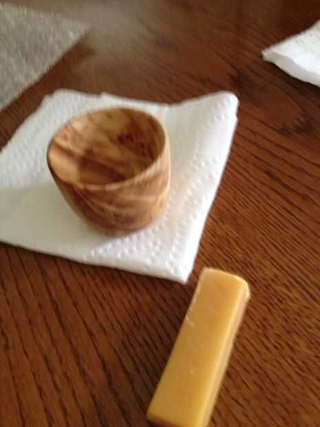 Hay muchos finales que se pueden utilizar pero elegí aceite de nuez y cera de abejas para la if un par razones. Número uno es que crea un resistente al agua y alimentos seguros sellan para la madera. Las compré en eBay por unos dólares y usarlos para todos mis alimentos seguros. Básicamente yo sólo uso una toalla de papel para poner una capa de aceite de nuez en la madera y luego deje que se seque durante la noche. Para esta Copa puse tres capas entonces smooshed sobre una capa de cera de abejas.
