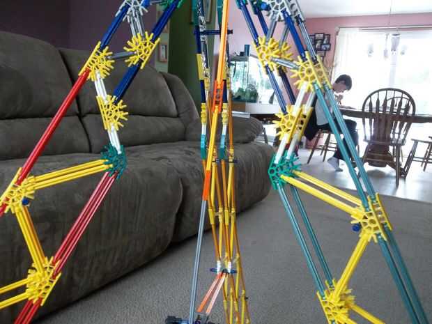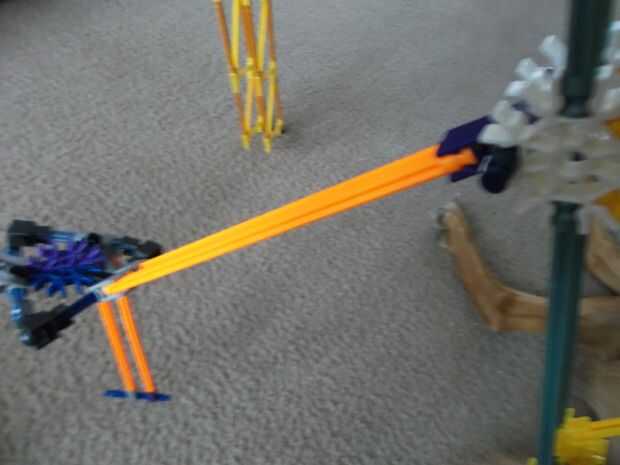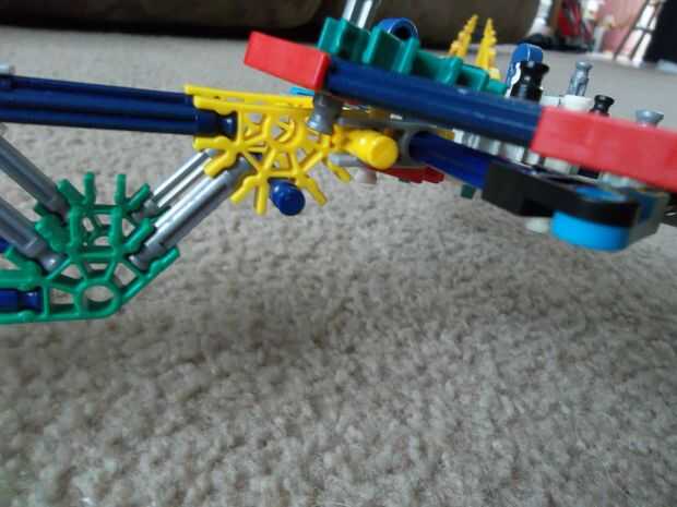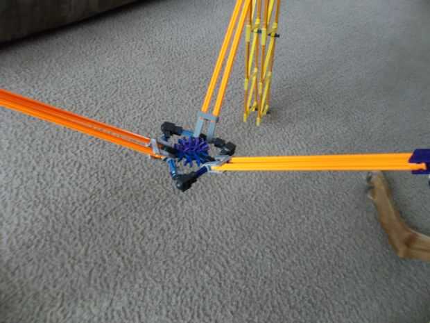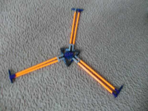 Luego necesitas tomar el apoyo Central y ajustar las barras azules de los conectores blancos en cada pierna. Por último Asegúrese de conectar el núcleo Central y pasarlo a través de los conectores blancos. Luego inserte el conector gris 9 la un conexión dejar de lado) entre los conectores blancos.