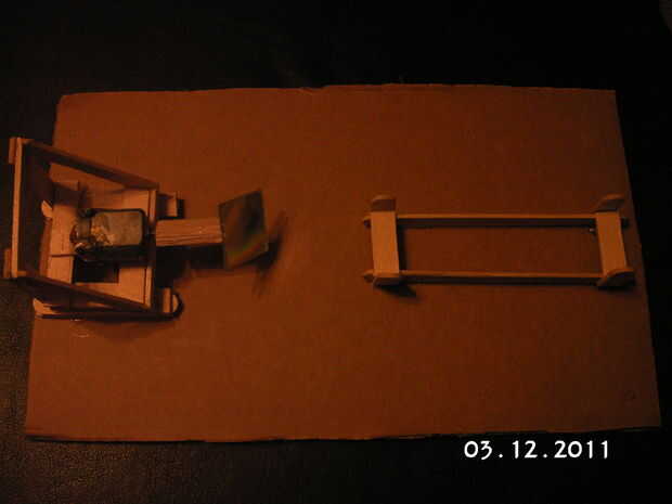 Ahora pega el soporte motor y laser centrado juntos en la cartulina. Ahora sólo que tienes que conectar la energía para el motor. Me gustaría sugerir dos AA con un interruptor por lo que es fácil de apagar y encender. Esto hace que el motor mover un montón lo suficientemente rápido como para crear maravillosos círculos de luz láser. No sugiero utilizar un poder superior como tiende a hacerlo vibrar demasiado y el espejo puede volar posiblemente creando una situación peligrosa. Sólo un paso más y listo!