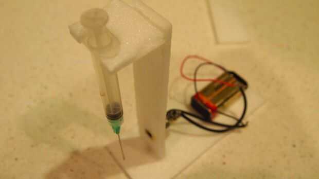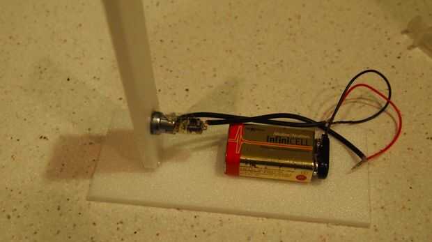 -Por último pegue uno de la pequeña plaza para que su aguja se cuelga en él, quieres tenerlo a la altura perfecta para que la punta esté a la altura del láser. Luego pegue la segunda plazoleta aproximadamente 1/2 '' por encima de su láser.