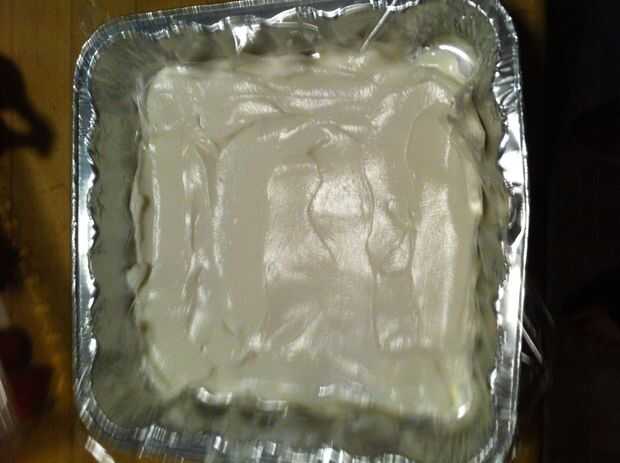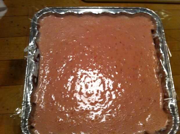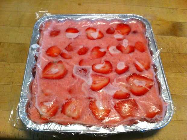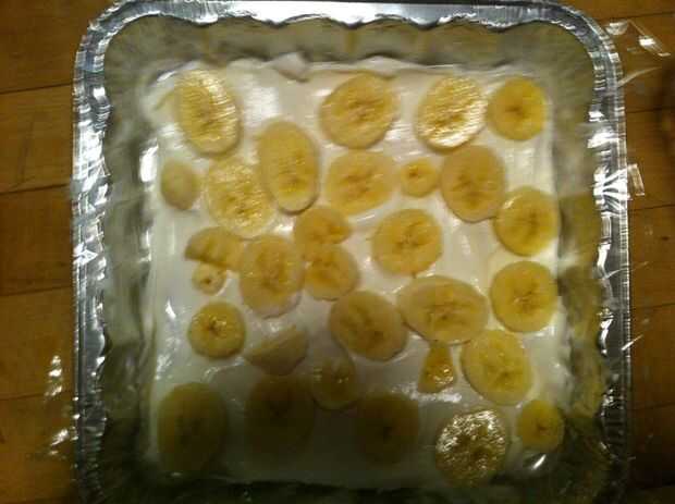 Línea del paso 2) un 8 x 8 pulgadas de la cacerola con envoltura de plástico transparente. Vierta el yogurt restante en la parte inferior y extensión para cubrir el fondo. De la capa en el último plátano en rodajas y verter la mezcla mezclada en la parte superior les. Decorar con las ocho fresas.
