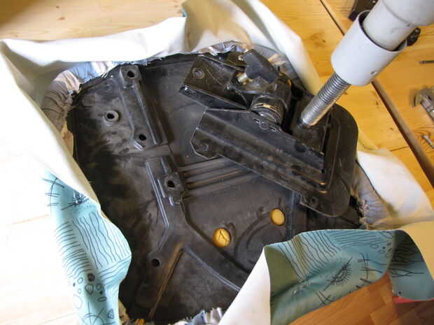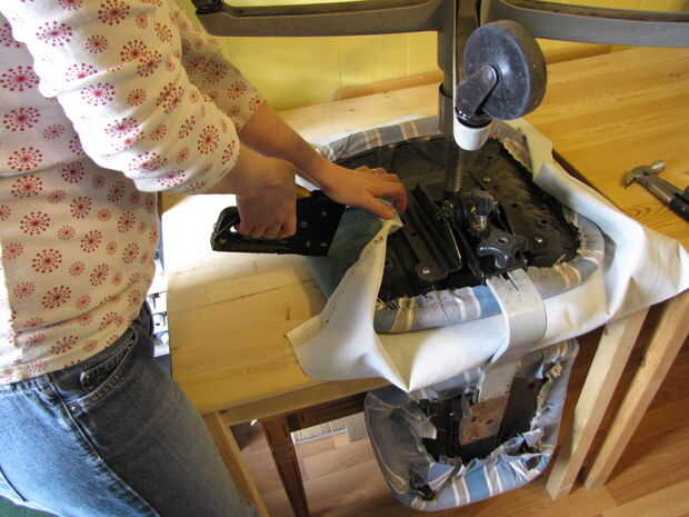 Recorte el tejido sobrante. No tiene que ser bonito, ya que es la parte inferior que no se verá. Utilizo un martillo para bash en unas grapas errantes que se negaron a ir todo el camino. La grapa impar por debajo interfirió con los en que estaba poniendo.