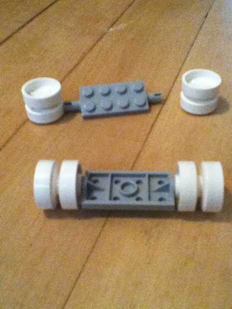 Tomar las 4 ruedas y sus 2 ejes y ponerlos juntos.