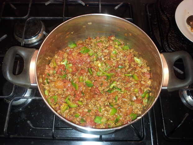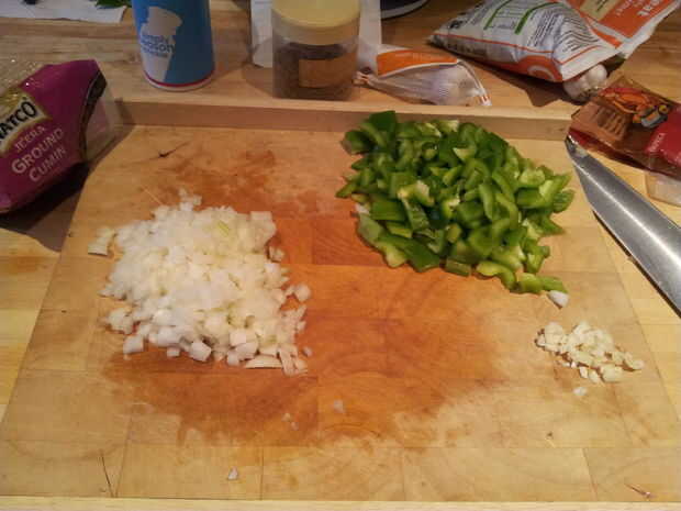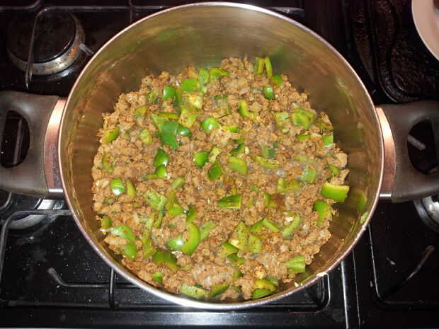 Poner un poco de aceite en una sartén grande y freír ligeramente la cebolla, teniendo cuidado de no quemarlo. Añadir el ajo, los pimientos y todas las hierbas y especias (si usas pimientos verdes como te tengo se necesita darle un poco más tiempo para que ablande).