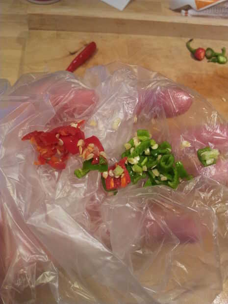 Para aquellos que no han utilizado los chiles frescos antes, asegúrese de que cuando usted los corta para arriba utiliza guantes o poner bolsas de plástico en las manos como lo hago. Si te gusta le Chili caliente pop toda la cosa, si no se evitaría añadir las semillas ya que son la parte más caliente de los chiles. También asegúrese de que ha comprobado cuán caliente los chiles son, tienen cosecha propia y no recuerdo el tipo, pero mi rojo son muy calientes pero dulce y dan un gran sabor, mientras que el verde no es tan caliente. Sólo tienes que elegir la cantidad y tipo de chiles basado en su gusto.