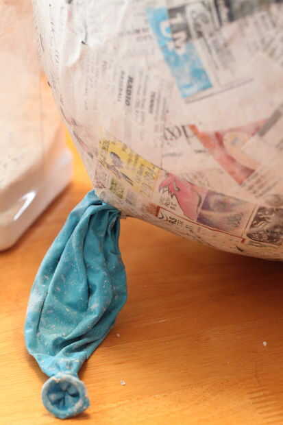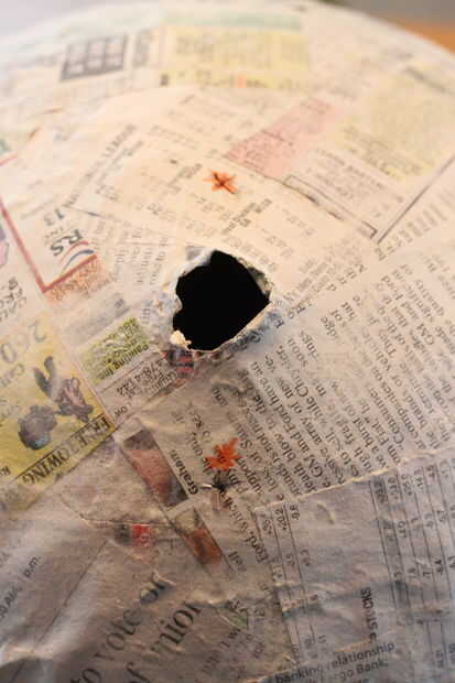 Utilice el agujero donde el globo fue quitado como la parte superior de la piñata, ya que necesitará un lugar para insertar la suspensión. Marque los puntos donde te cortan los agujeros... puedes ver cómo exacto soy yo realmente en comentar acerca de 1 pulgada lejos del orificio principal. Corte cuidadosamente los agujeros – sólo usé un cuchillo de cocina pequeño.