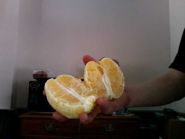 Deje enfriar un minuto o tan y pélalo. Sabe muy bien caliente, pero se puede dejar enfriar si quieres. La naranja todavía sabe a lo mismo!