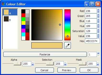 3) directamente por encima de la paleta de colores en el lado izquierdo de la pantalla, hay una pequeña caja (mostrada abajo) con dos cuadrados de color que se muestra en él. Haga clic en la caja superior izquierda para hacer el mismo cuadro de selección de color (mostrado abajo) que jugaba con en el editor de paleta.