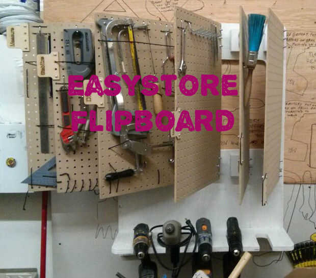 Es un sistema de almacenamiento que monta varias hojas de pegboard en bisagras para que las páginas se pueden dar vuelta como un libro. Luego se monta en una pared. Esto es una gran manera para maximizar el espacio de almacenamiento y para mantener las cosas organizadas. Que estoy construyendo sostenga las herramientas eléctricas, pero se puede utilizar para almacenar cualquier cosa, especialmente con el método elástico acorde.