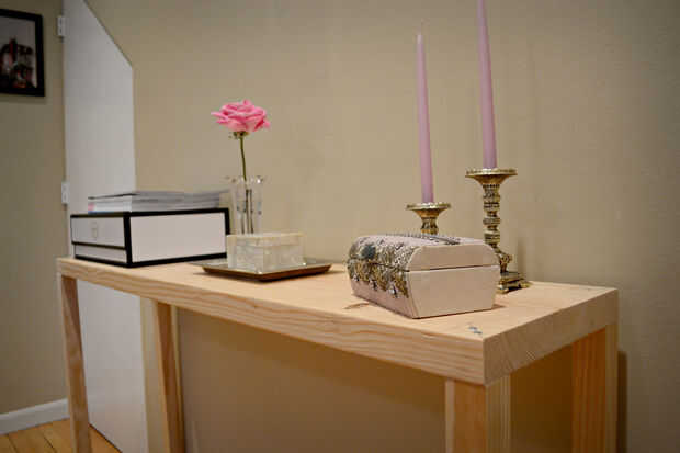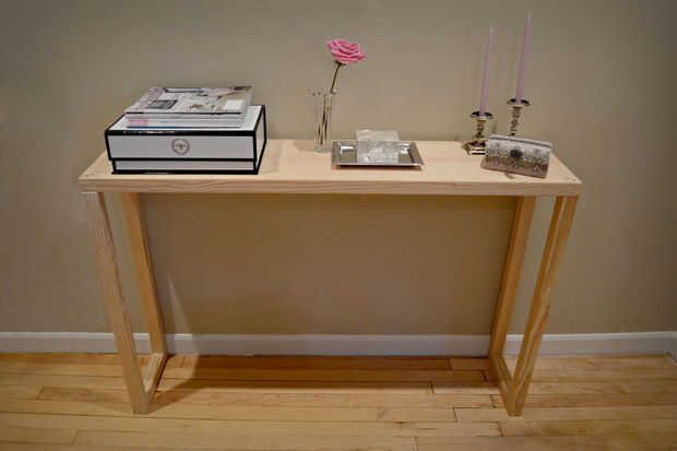 Esta tabla de entrada se hace con un mostrador de madera, emparejar las piernas afiladas y perillas, así como un marco de madera contrachapada. Necesitaba algo bastante pequeño para caber la zona al lado de mi puerta, así que esto es lo que he constr