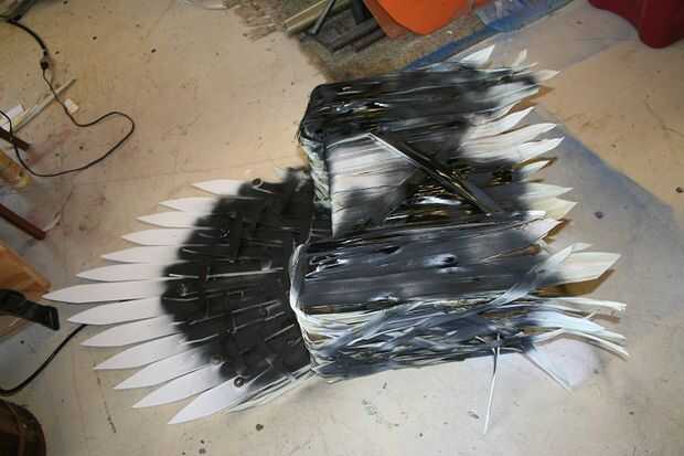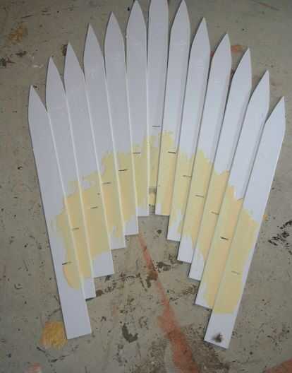 La capa posterior de "espadas" son los listones de las persianas que corte con una sierra de banda para dar los extremos puntiagudos. He añadido otra capa de listones que cortan en varios tamaños, utilizando las piezas de chatarra de los listones para /pummels de empuñaduras de las espadas. La parte superior de las asas de las espadas están adornados con botones.