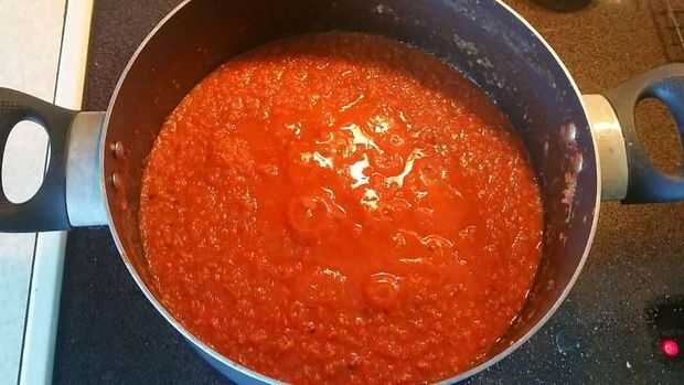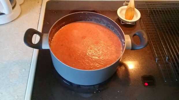 Ahora que tenemos un bote de tomate licuado "Baba rosa" como lo llama Arthur. Es hora de poner hervir a fuego lento. El aire en la pasta de tomate es lo que hace que el color rosado como cocineros abajo consigue más rojo y más salsa en busca.