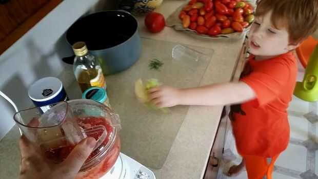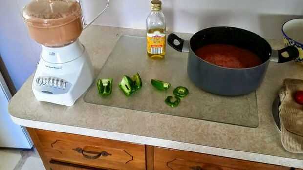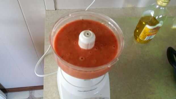 Paso 5, licuar todos los ingredientes en un procesador de alimentos hasta que quede suave. Sí he utilizado las semillas de los pimientos y las pieles de los tomates realmente no sé el propósito detrás de blanqueo para eliminar las pieles pero siempre he licuado con los tomates. Es bastante el proceso LIQUEFY (Licuar) la descarga dentro de la olla, licuar más, más volcado, enjuagar repetir.