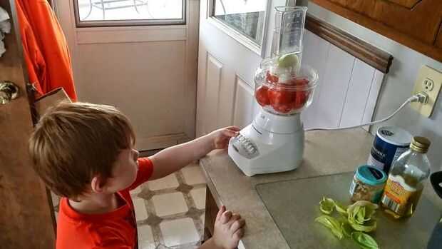 Como las cuchillas de corte en los niños de envase puede ayudar a echar los ingredientes en la alimentación del procesador y como presionar los botones.