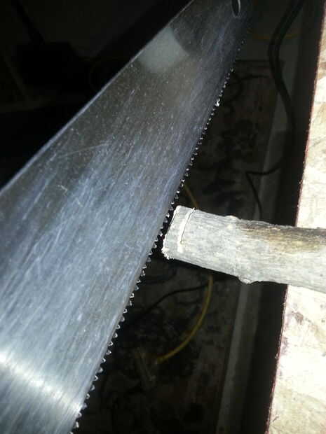 Cuando haya encontrado una buena rama con corte inicial. La rama es un buen tamaño y no ser a grande entre los dedos. Me encontré con una sierra de mano trabajado mejor para cortar la rama. Iniciar con el corte a tu sucursal con un corte recto. Reducir poco a poco y tómate tu tiempo. Asegúrese de hacer un corte liso en la parte inferior de la rama. Ahora corte la rama una segunda vez para cortar la parte para el anillo. Este corte aproximadamente 1-2 centímetros dependiendo del ancho del anillo que desea. Asegúrese de que esta corte hacia abajo incluso con el borde para que el anillo es recta. Cortar unos pocos a la vez en caso de que se quiebren durante el corte el orificio.