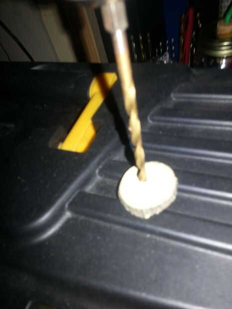 Esta es la parte donde tiene que tener cuidado de no romper el anillo. Comencé por perforar un pequeño agujero en el centro o la madera. Después de tener un pequeño orificio perforado utilice un dit más grande para hacer el agujero más grande. Usted puede tomar el pedacito de taladro y moverse para crear un agujero más grande. Hacer esto otra vez con un poco más grande. Lleno del anillo presionado para que no se mueva con el giro del taladro.
