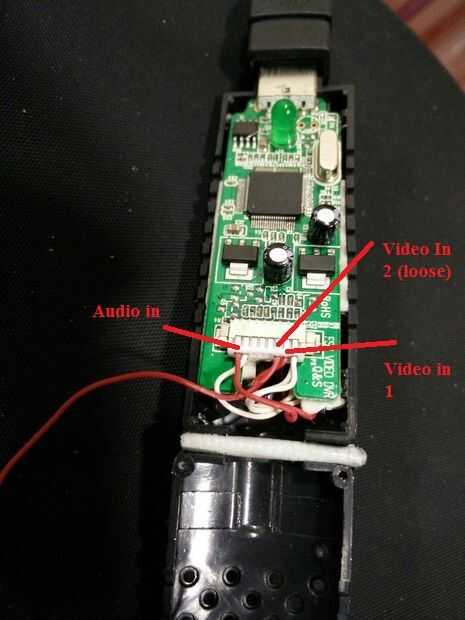 1. • Únete los motivos de señal (cables blancos) y la soldadura con el conector de tierra cerca de la clavija de video (más cable rojo hacia la derecha).