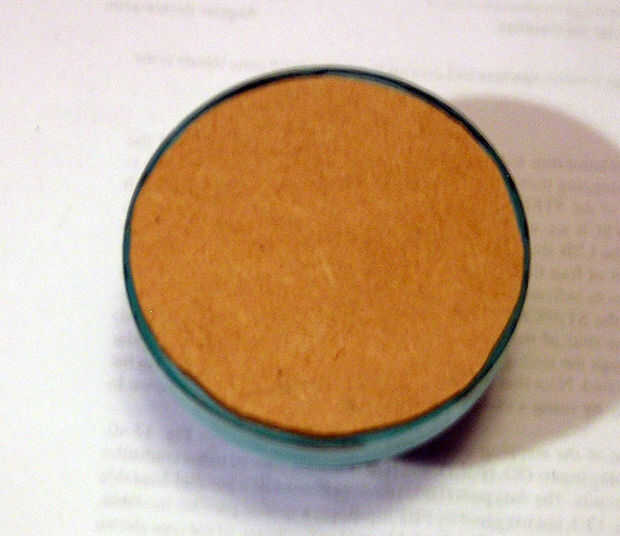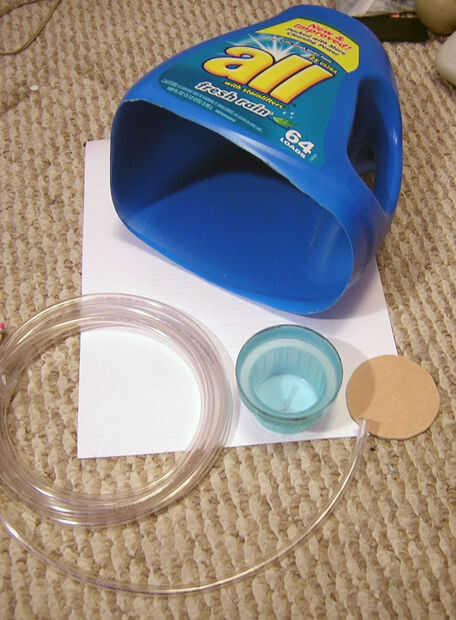 Quite la tapa de su botella de detergente y lave (la botella de detergente y tapa). Coloque tornillo-lado de la tapa contra el cartón prensado o cartón y trazar su contorno. Recórtalo con un rompecabezas, tijeras, dremel, etc.. Haga dos orificios en el centro con un ~ broca 0,70 mm. La idea aquí es conseguir que sea pequeña porque sólo vas a roscar que el mic conduce a través de ellos.