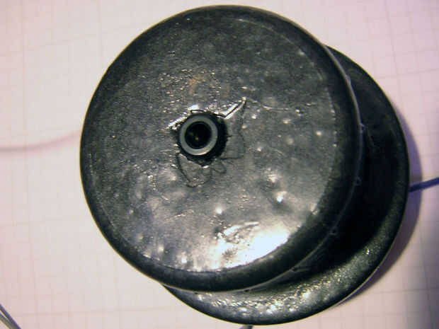Una vez hecho esto, caliente el pegamento (no confíe en el lado adhesivo de fieltro) o una almohadilla de fieltro pequeña al centro de los dos orificios de cemento. Taladrar los orificios teniendo cuidado de no aspirar el colchón fieltro (cuando lo hagas sabrás lo que quiero decir). El protector de fieltro es otra medida que originalmente utilizado en transmisores ultrasónicos de amortiguador. Taladro, archivo o una muesca en el borde del disco de madera lo suficientemente grande para los cables de conexión de 5 caber a través de la arena.