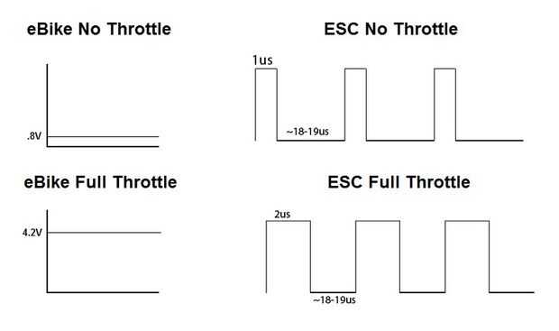 Controladores de motor ebike aplicaciones están diseñados para conectarse a una válvula reguladora de efecto Hall que varía de sobre .8V para ninguna válvula reguladora para unos 4.2V de acelerador a fondo. Controladores de motores para aplicaciones RC (llamados controladores de velocidad electrónicos o ESC en la comunidad de RC) están diseñados para conectar a módulos de receptor RC que la salida un 1 ms de pulso para ninguna válvula reguladora y un máximo de 2 ms de pulso de acelerador a fondo.