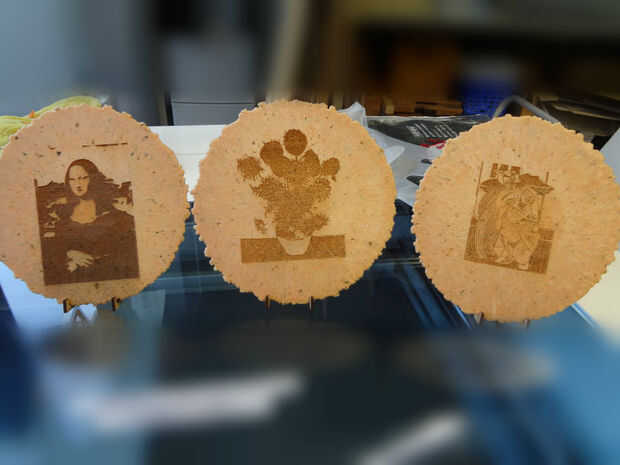 レーザーカッターを用いて、えびせんに絵画を彫刻してみました。