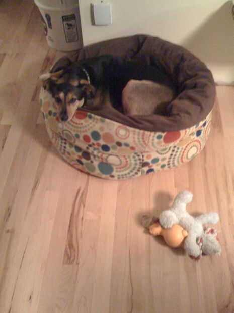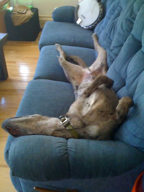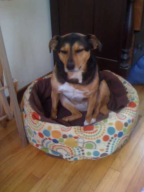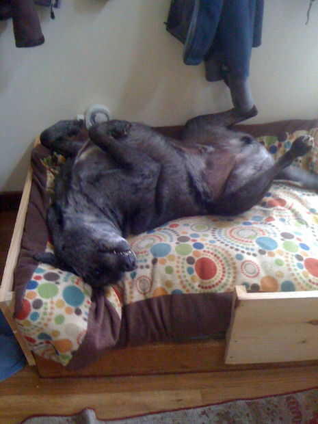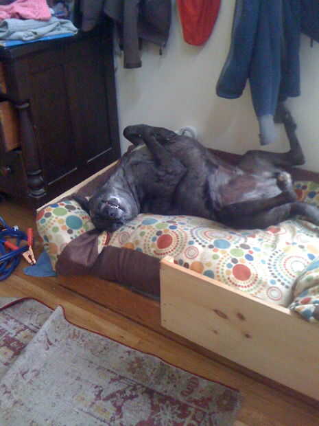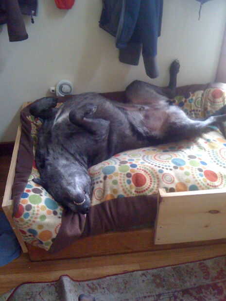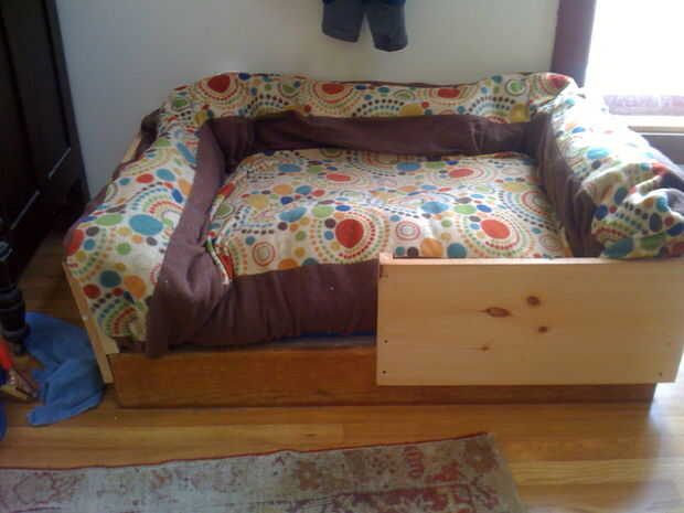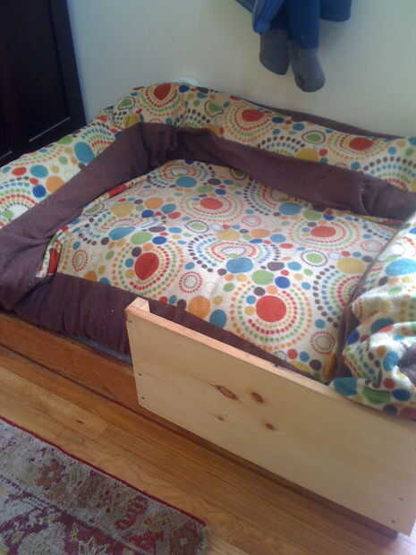 El sofá cosido de la misma idea de nuestro sofá, sólo disminuido hacia abajo. Le dio estructura rodando algunos tejidos alrededor de un tallarín de piscina, y la parte inferior es muchas capas de mantas dobladas.
