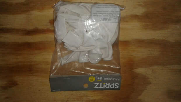 Materiales:Globos x 3Bolsas de plástico x 3Cinta de enmascararExpansión de espumaPantimediasTuberia de riegoRiego se une - ángulo recto x 18, x 1 Cruz, en forma de T-x 2Palillo del resplandor x 2Pelotita de ping pong x 1Bridas x 4Envase de la medicin
