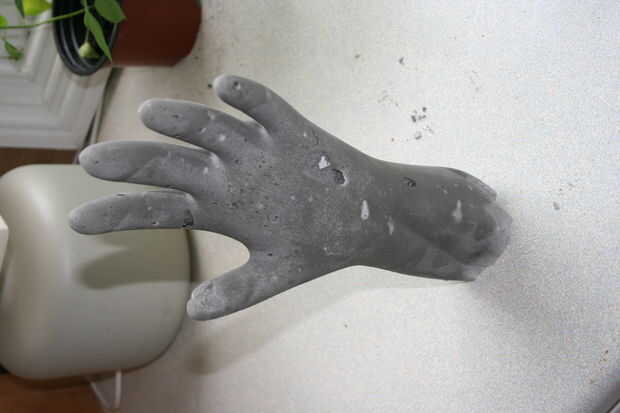 Los agujeros que se puede ver en la mano se llaman orificios y son causados por burbujas de aire atrapado. Puede eliminar estas usando un húmedo mezcla y vibrante o shaing el hormigón en el molde un poco más.