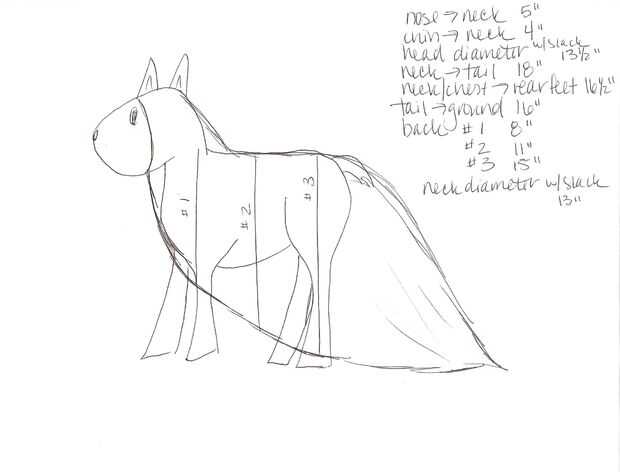 En primer lugar, medir a su perro. Tomé una larga cantidad de mediciones que incluye lo siguiente: la nariz del cuello, la barbilla al cuello, diámetro de la cabeza, diámetro de cuello, cuello hasta la cola, cuello, tórax a patas traseras, cola al suelo, entonces divide su longitud posterior en tercios y medir esa distancia a la tierra en cada uno de los tres lugares (hombro, media espalda, cola).
