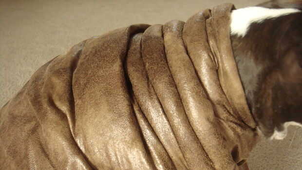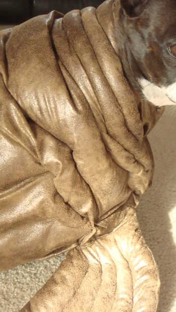 Después de que tuviera las capas "perfectamente" cubrió juntos, la llevé a mi máquina de coser, y cuando la pelusa golpeó el ventilador... así que a hablar. Pellizca las capas juntas sobre 3-4" de la cubierta elástica, o donde el bateo y esencialmente pinchado sobre un 1-1.5" de grasa y cubrió por todo el traje. Luego lo cosió en la máquina haciendo un rollo bien. Luego intenté replicar otra vez y otra y otra vez para el resto de la grasa pero mi máquina de coser solo no podía manejar. Así que antes de llegar demasiado molesto, cambié para coser a mano. El cuello son una combinación de una puntada de funcionamiento ajustada a viradas dependiendo de la anchura y la densidad que quería lograr. Yo rodé los rollos de grasa delantera alrededor en el pecho y había emparejado hasta dar la ilusión de cubrir la piel suelta. ¿Lindo, derecho? Entonces el último pocos rollos fueron traídos hacia el lado a donde esencialmente se caería la axila. Esto hicieron una división a la grasa, como una morsa real, donde la aleta está conectada al torso.