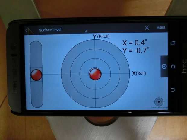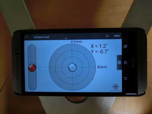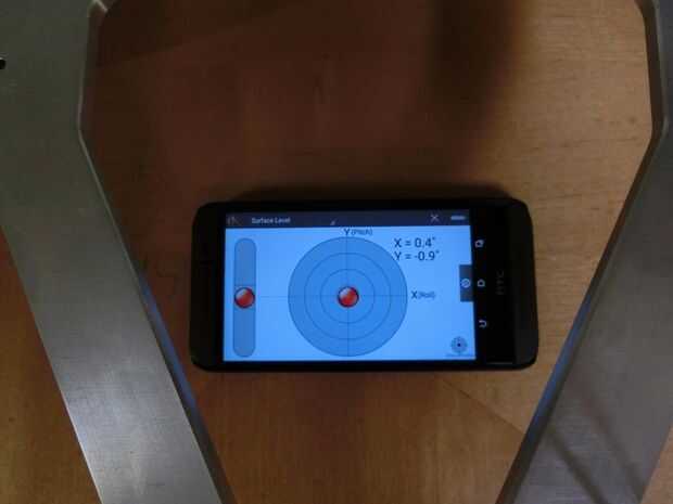3. use su nivel y compruebe para asegurarse de que la mesa en que construyen nivel. Si no es así, necesita compensar más adelante. Utilizando un nivel de smartphone es más fácil porque usted puede tener en cuenta en qué ángulo es su tabla (en este ejemplo, sólo se preocupan por el eje X del nivel).