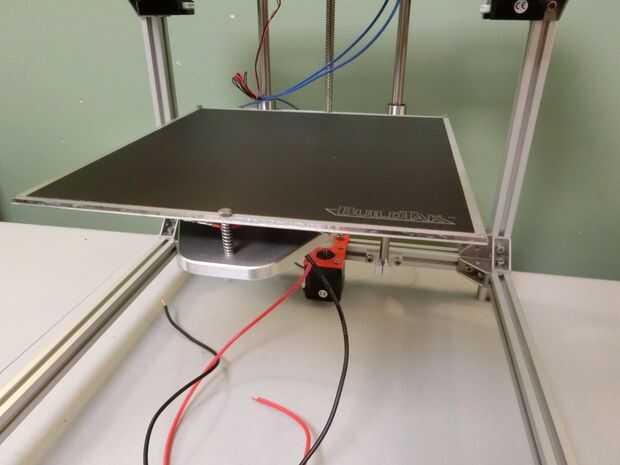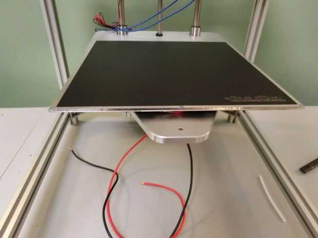 1. (no fotografiados) preparar construir plataforma aplicando superficie BuildTak al principio, soldar los cables para las almohadillas de contacto de fondo según lo dirigido por las instrucciones en el tablero e insertar el termistor de la cama en el agujero en el centro de la cama y asegurándolo con cinta de alta temperatura.