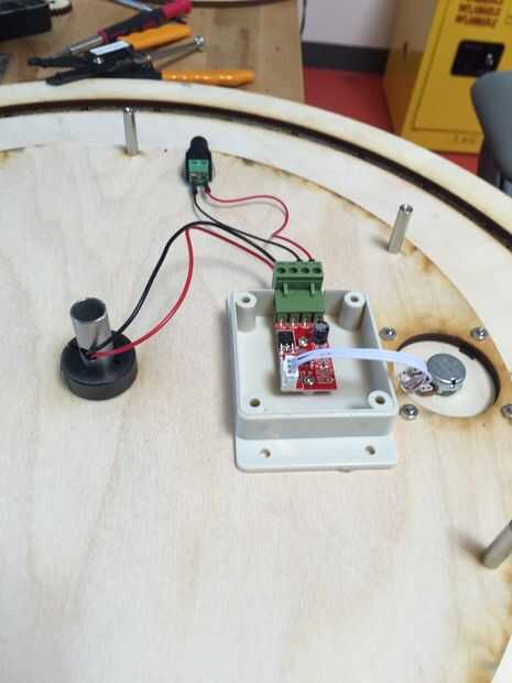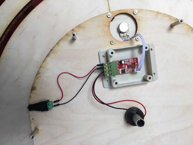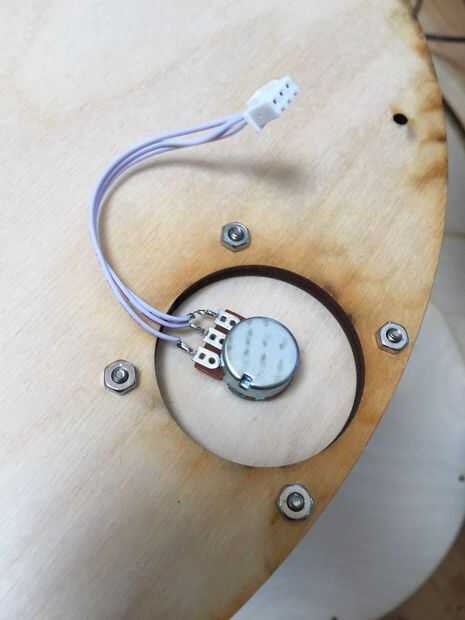 A continuación, añadí la placa de madera contrachapada de 1/8" con el potenciómetro desmontado que se le atribuye. Para obtener los contactos de marcha en el lugar correcto, la placa tiene que ser en el exterior (frontal) del disco montado en la pared. Esta placa se atornilla con tornillos 4-40 a través de orificios tamaño 1/4" pieza de madera contrachapada.