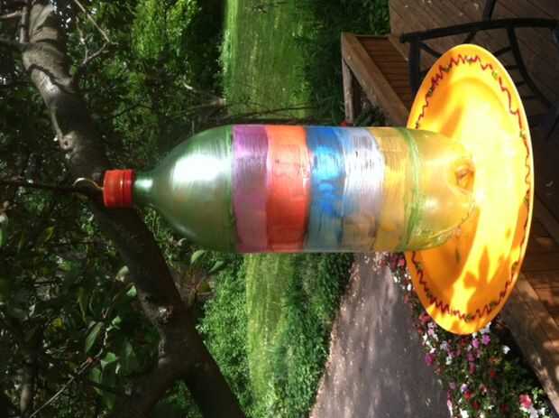 Este paso es totalmente opcional, pero si quieres que sienta libre de decorar su casa del pájaro. Decoramos esta pajarera por sacar la envoltura y pintar la botella con un surtido de colores. También utilizamos brillo para decorar la parte inferior de la placa! La pintura que utilizamos tiene un brillante metálico brillo, que es útil cuando se trata de atraer pájaros a su comedero. Consejo: esperar a que el pegamento y la pintura (o lo que sea que haya utilizado) para probar antes de poner el comedero.