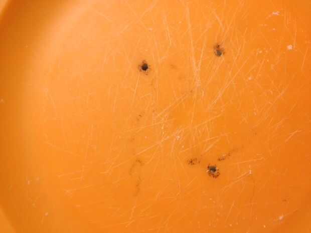 Ya que hemos utilizado una botella de 2 litros, nos escogió a tres de los cinco fondos y taladrar agujeros en la parte inferior de la botella y la placa. Consejos de : usando un marcador de color negro, hacer puntos en la parte inferior de la botella donde perforar y presione la botella hacia abajo en la placa. Al levantar la botella, debe de crear tres puntos negros. Los puntos son para ayudar a usted averiguar dónde perforar.