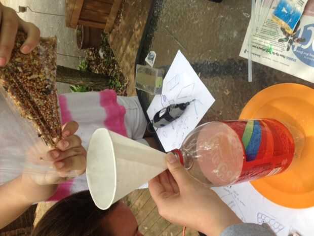 Felicidades! Has creado este comedero de pájaros reciclado la 100%, pero no una casa de aves hasta que añades a la comida de pájaro! Cuidadosamente con un embudo, desenrosque la tapa e Inserte el embudo en la parte superior de la botella. A continuación, con cualquier tipo de alimentación del pájaro, vierta la alimentación dentro de la botella. Ya que esto es del 100% materiales reutilizables, machacando viejo cereales y otros granos, puede crear alimentación de aves sin tener que perder dinero en absoluto!