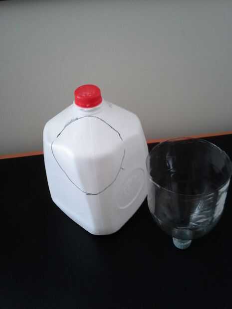 Tomar la parte superior de la botella de refresco y lugar casquillo opuesto hacia arriba de la manija de la jarra de leche. Trace una línea alrededor de la botella de refresco con un rotulador mientras se aplica presión a la jarra de la leche y la botella de soda (puede que necesite una mano extra para ayudar a trace una línea alrededor de la botella de soda).