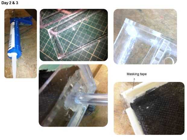 Después de alrededor de 5 minutos, he intentado insertar la bandeja interna en la bandeja, sin embargo porque fueron sellados los bordes de la bandeja con el sellador, que tuve que achaflanar los bordes de la bandeja interior utilizando una lima de aguja. Luego insertar la bandeja interior de la bandeja y había utilizado el sellador alrededor de los bordes de la bandeja interna. Cuando apliqué el sellador que veía bien, correctamente no fue guiado. Así que para mi segundo intento, he usado cinta adhesiva; aproximadamente 5mm por encima de la membrana porosa alrededor de los bordes, y por lo que después apliqué el sellador, después de que trató de el sellador restante utilizando el cuchillo Stanley.