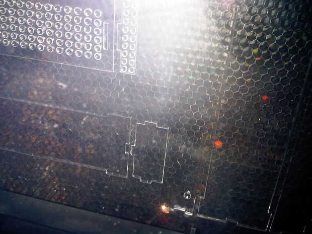 Para comprobar la consistencia y el bien funcionamiento de la máquina de láser, he hecho varias pruebas, con la configuración para asegurarse de que es conveniente cortar la madera contrachapada y acrílico necesario. Consistió en dibujar círculos, cuadrados y triángulos, y luego imprimirlas en un plástico de desecho. Comprobación en esencia con el ajuste adecuado para imprimir, no quería que el láser sea demasiado fuerte o demasiado débil, sólo lo suficiente para cortar a través del material.