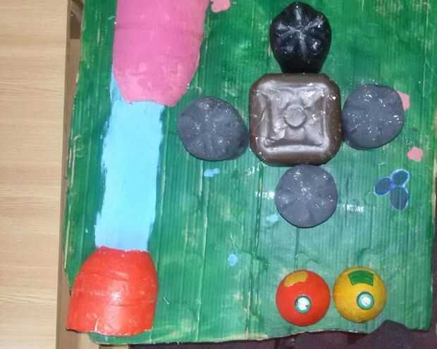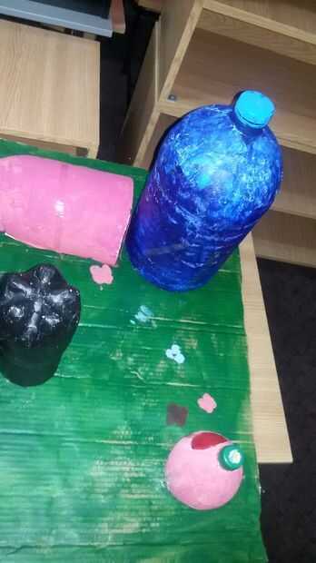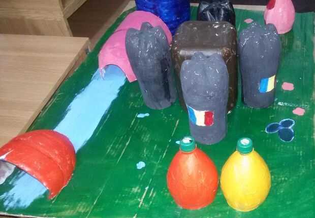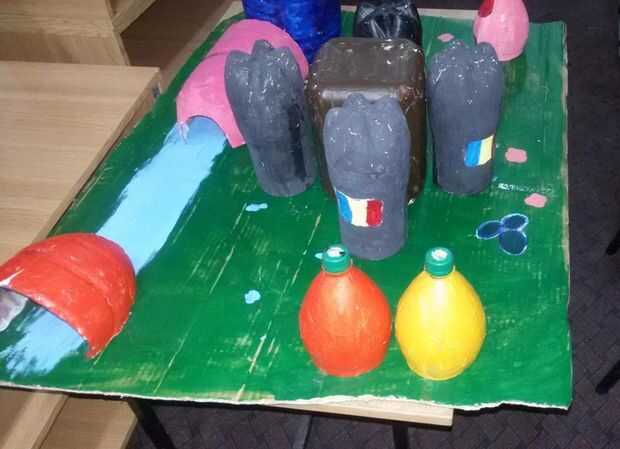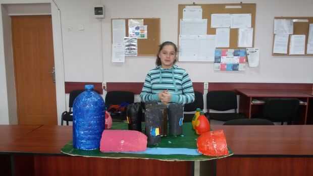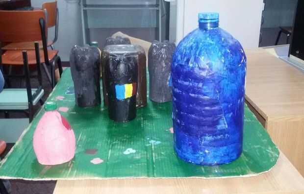 El diseño sugiere una manera de proteger el planeta de la contaminación. Estaba hecha de papel, pegamento, colores, marcadores, cartulina.