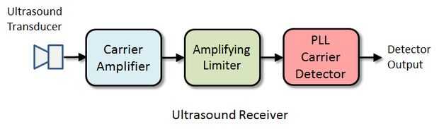 Los cálculos para el ejemplo de "Sonar complejo" indican que un aumento mínimo del amplificador de 2500 es suficiente para cumplir los objetivos de la sensibilidad. No es práctico construir un amplificador de una etapa con una ganancia de 2500 así que en lugar de otro se utilizan dos etapas con una ganancia de 50. La primera etapa se configura como 40 KHz soporte amplificador con una ganancia de 50. La segunda etapa se configura como un limitador, también con una ganancia de 50. La ganancia del amplificador de portadora y limitador se multiplican para producir la ganancia total del sistema de 2500. Si es necesario, cada amplificador etapa ganancia puede aumentar o disminuir (mínimo 30, máximo recomendado 100) depende de la los objetivos de diseño del receptor. El propósito del limitador se explicará más adelante.