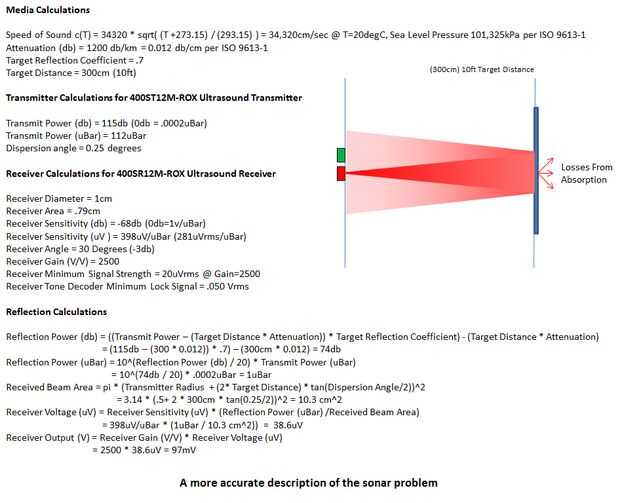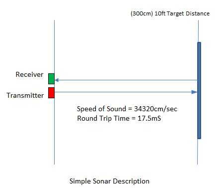 El ejemplo de "Simple Sonar" anterior describe lo que el transmisor y el receptor están intentando hacer. Un frente de onda de ultrasonido se propaga desde el transmisor, rebota de un objetivo y es detectado por el receptor. Midiendo el tiempo de ida y vuelta entre el inicio de la transmisión y la reflexión detectada, y en comparación con la propagación se puede calcular la velocidad del sonido, la distancia entre transmisor y objetivo. La fórmula es: